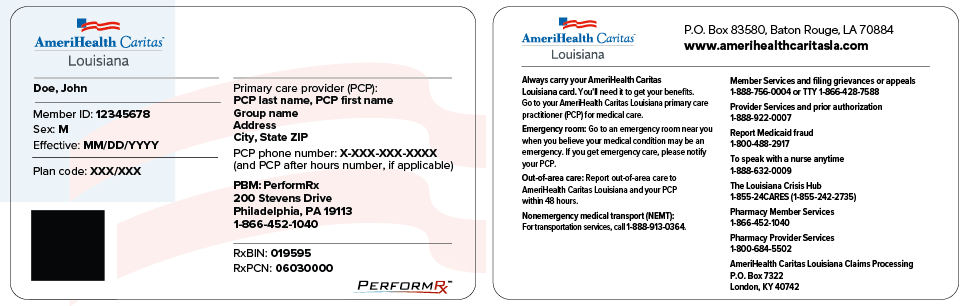 Each family member will get his or her own AmeriHealth Caritas Louisiana ID card. When you get your ID card in the mail, check all of the information on the card. If there is a mistake on the card, please call Member Services at 1-888-756-0004 (TTY 1-800-220-5404).